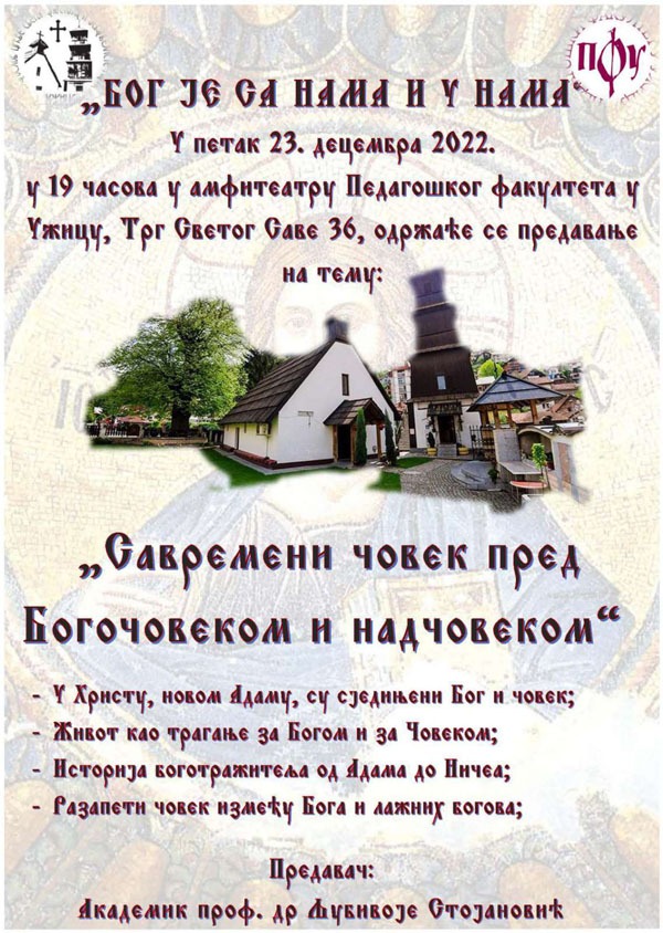 Најава: Ужице, 23.12.2022. Проф. др Љубивоје Стојановић, “Савремени човек пред Богочовеком и надчовеком“