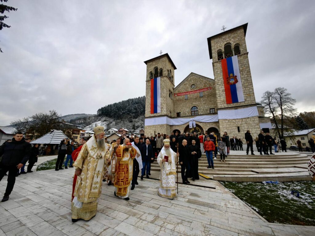 Торжествено литургијско сабрање започело је свечаним чином великог освећења Светосавског храма у Фочи којим је началствовао Његова Светост Патријарх г. Порфирије уз саслужење високопреосвећене и преoсвећене господе архијереја: дабробосанског Хризостома, црногорско-приморског Јоаникија, жичког Јустина, диселдорфског и немачког Григорија, славонског Јована, бихаћко-петровачког Сергија, захумско-херцеговачког и приморског Димитрија, будимљанско-никшићког Методија, шабачког Јеротеја и јегарског Нектарија.